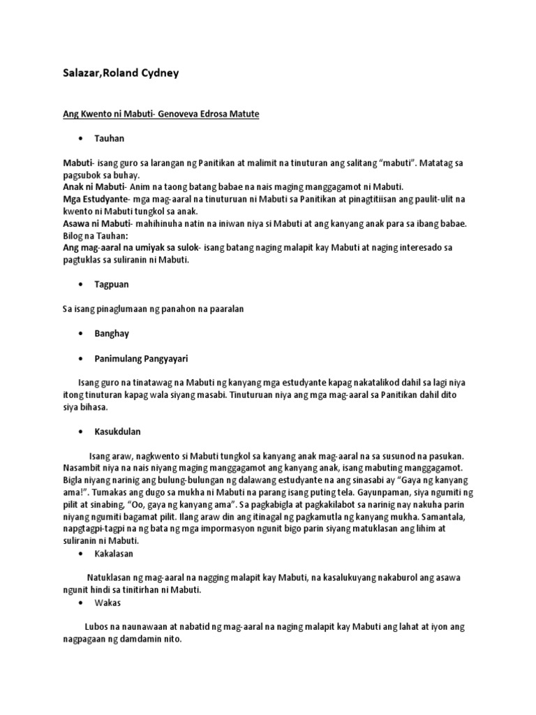 Si Mabuti ay balo. Tagapagsalysay ang nag sasalaysay sa kwento na mismung studyante din ni Mabuti. Mga Tauhan edit edit source.