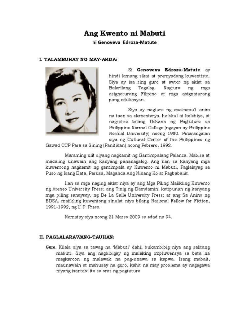 Tagapagsalysay ang nag sasalaysay sa kwento na mismung studyante din ni Mabuti. Genoveva Edroza-Matute Mga Tauhan. Tauhan sa Kwento ni Mabuti Genoveva Edroza-Matute Wiki.