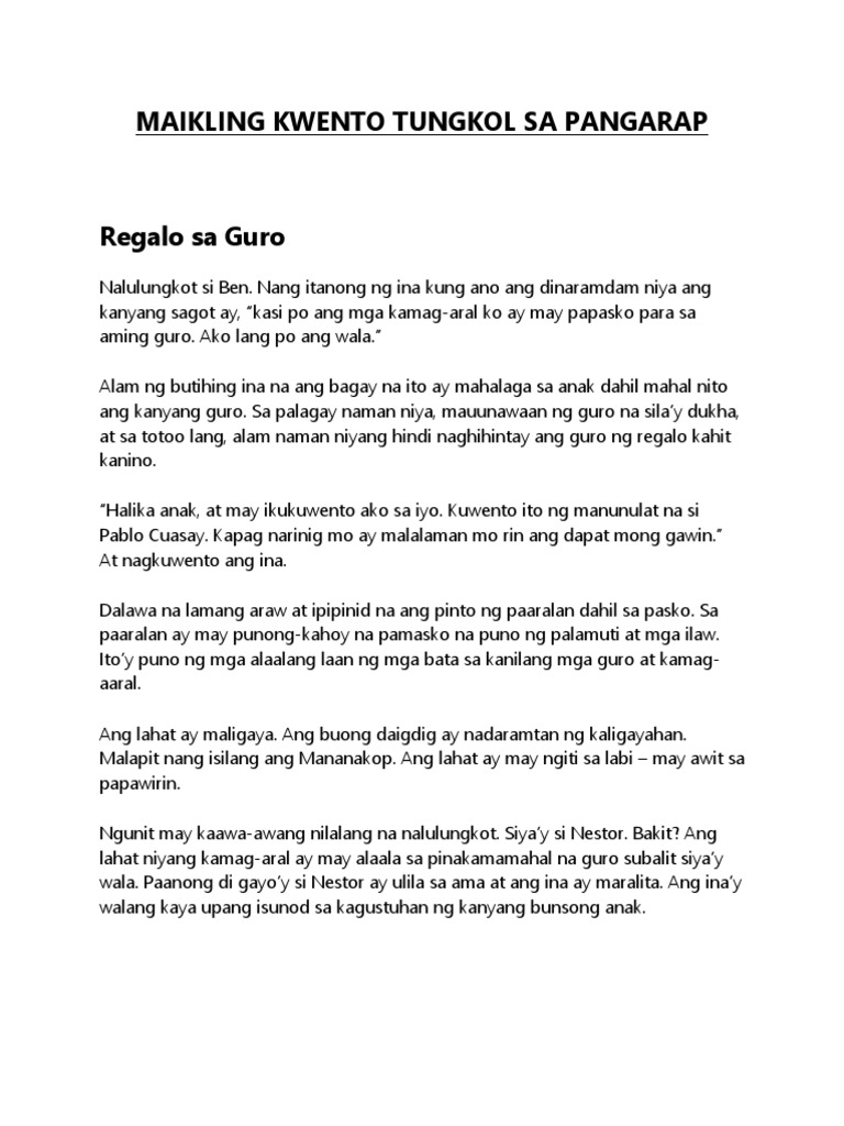 Nang ilalagay na niya ito sa buslo bigla itong nagsalita Huwag. Pero sadyang kay lupit ng tadhana dahil pagkatapos niya ng highschool ay wala silang kakayahan na makapag-aral siya ng kolehiyo. Sanaysay vs Maikling Kwento.