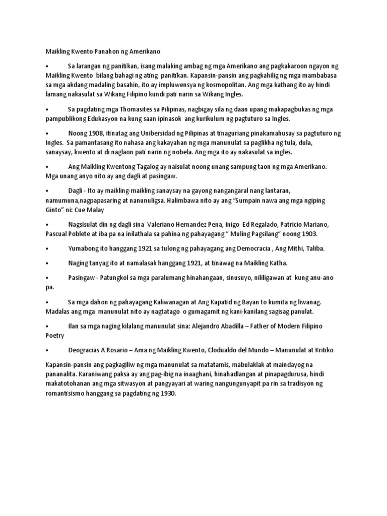 Maikling Kwento Panahon Ng Amerikano Docx