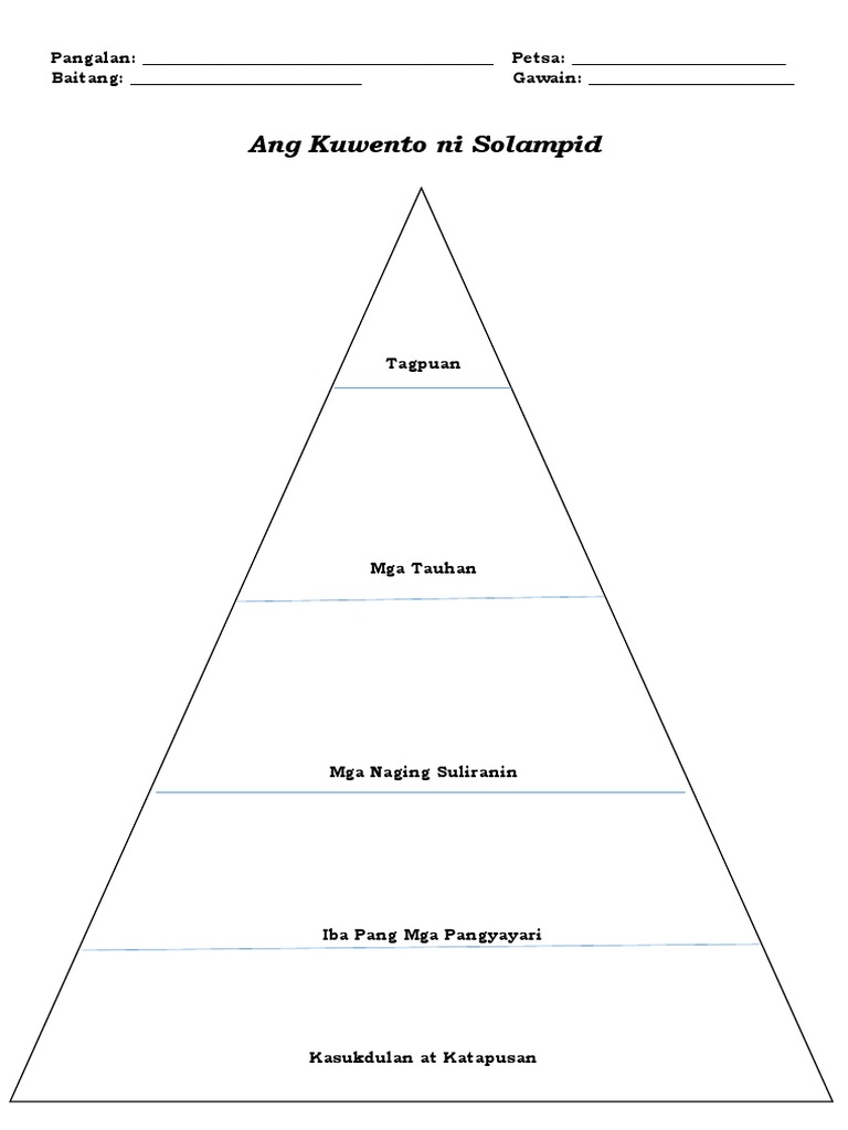 Sinadya niyang ihulog ang mga ito sa harap ni Solampid. Ang maikling kwento ay maaaring batay sa imahinasyon o sa a Reply. A a Kabilang dito ay ang panimulang pangyayari kung saan ipinakikila ang mga tauhan at ang tagpuan papataas na pangyayari kasukdulan pababa ng pangyayari at ang a Answer.