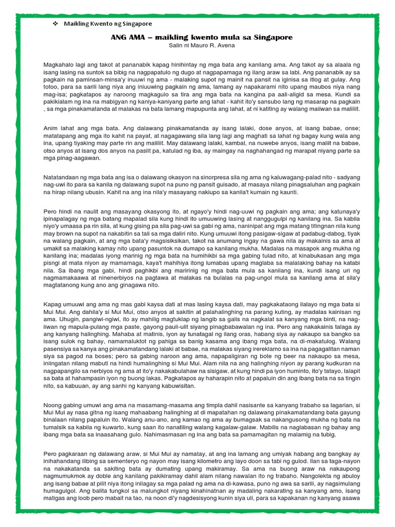 Nakahanap naman ng trabaho si Mia. MAIKLING KWENTO Narito ang limang 5 halimbawa ng mga maikling kwento na mapupulutan ng magandang aral. Hikbi ni Mabel habang nakaratay ang kanyang Itay na wala ng buhay.