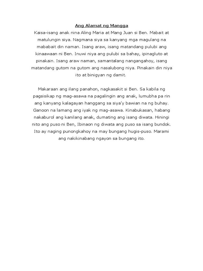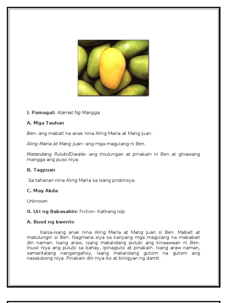 Check ninyo ang mga iba pa naming posts marami pa kaming mga buod. Alamat ng Mangga - Nakilala ng lahat ang masarap na prutas na tinawag nilang mangga mula sa pinagsamang pangalan nina Aling Manggita at Mang Pangga ang mabubuting mag-asawang nagsakripisyo para sa mga anak at para sa lahat ng taong hanggang ngayon ay patuloy na nakakain ng masarap na bunga ng mangga. Ang mga alamat ay parte ng ating mga karunungang bayan.