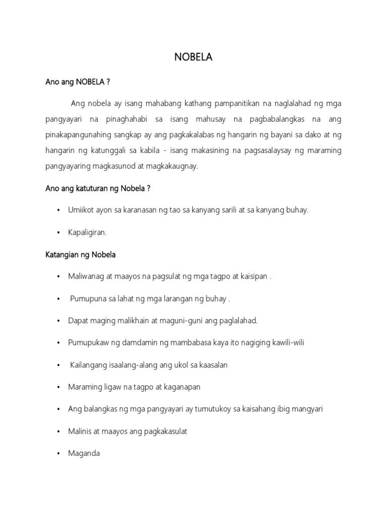 Nobela Docx Nobela Ano Ang Nobela Ang Nobela Ay Isang Mahabang Kathang Pampanitikan Na Naglalahad Ng Mga Pangyayari Na Pinaghahabi Sa Isang Mahusay Na Course Hero